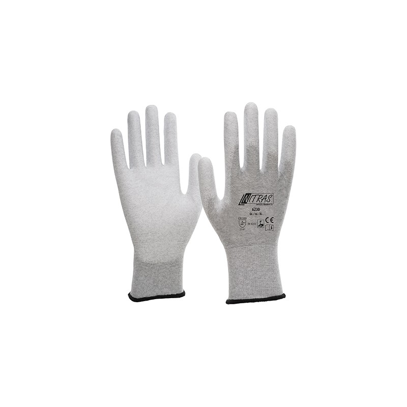 Nylon-Carbon-Handschuhe, weiße PU-Beschichtung auf Innenhand und Fingerkuppen, Strickbund, antistatisch, touchscreen-fähig.