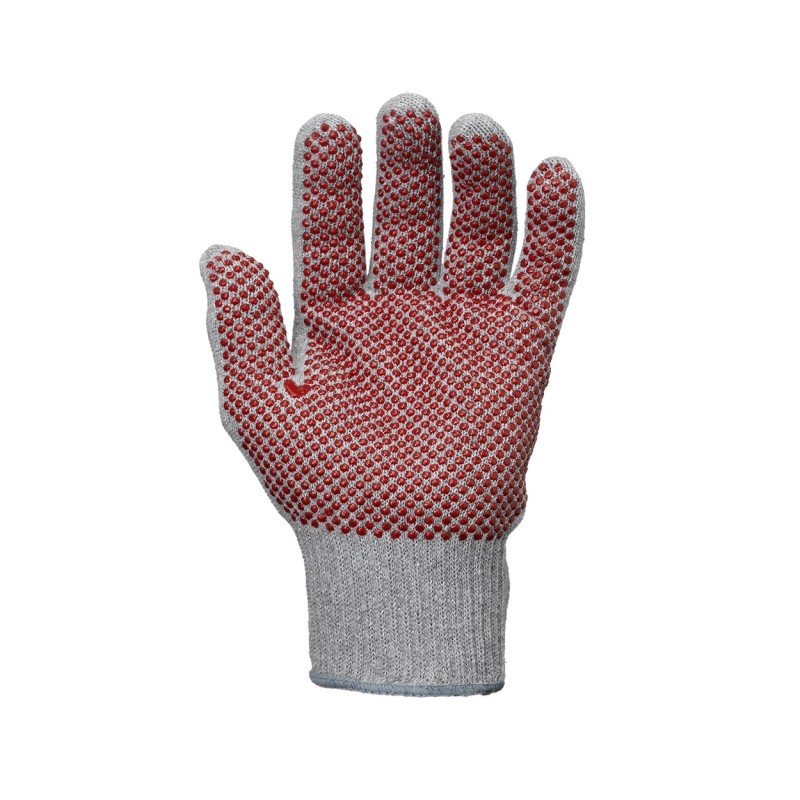 34% Baumwolle, 41 % Polyester, 25% Polyvinylchlorid-Mittelstrickhandschuhe, rote PVC-Noppen, Strickbund.