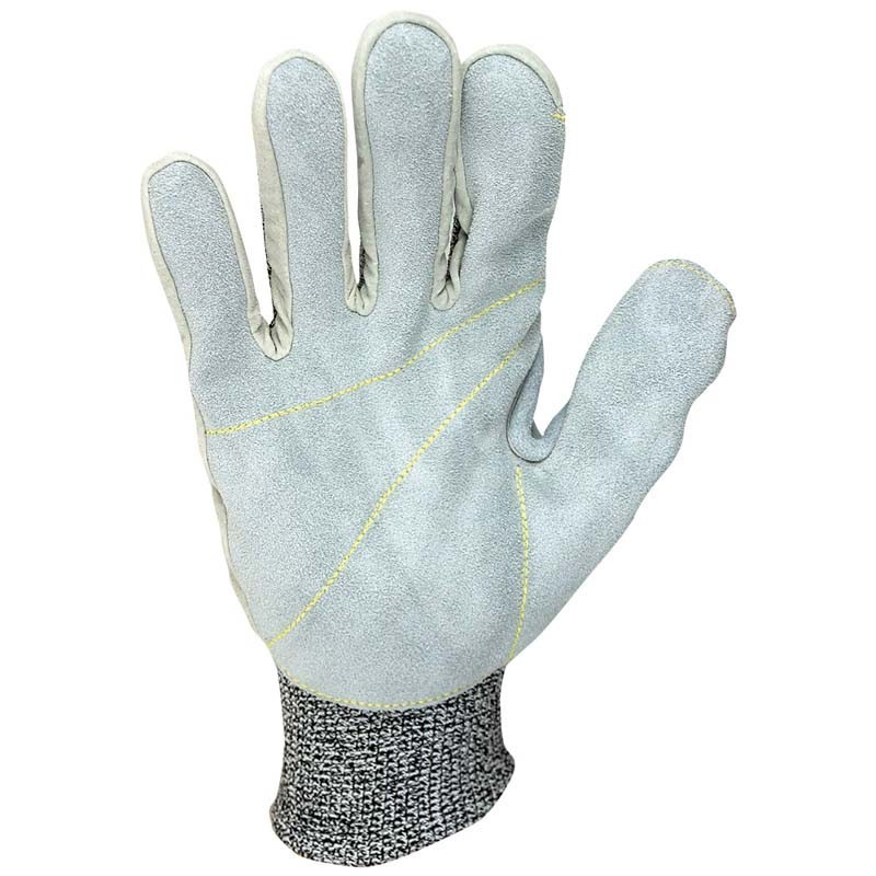 Strick-Leder Schnittschutzhandschuhe, Handinnenfläche, Fingerkuppen und Schichtel mit Rindspaltleder-Besatz, HPPE/Glas-Faser, Rundstrick - nahtlos, Strickbund, angenehmer Tragekomfort, atmungsaktiv, sehr gute Passform, sicherer Griff in trockener, öliger, fettiger und leicht feuchter Umgebung.