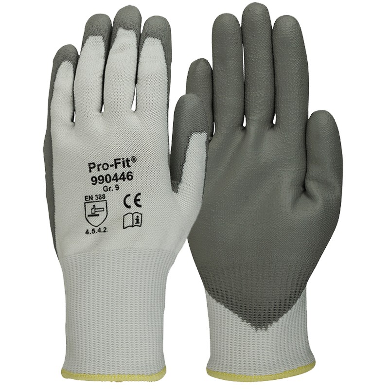 PU-Schnittschutzhandschuhe mit HPPE-Faser, Rundstrick - nahtlos, Strickbund, angenehmer Tragekomfort, atmungsaktiv, sicherer Griff mit exzellentem Tastgefühl, hohe Abriebfestigkeit, hervorragende Passform, Schnittschutzstufe 5.