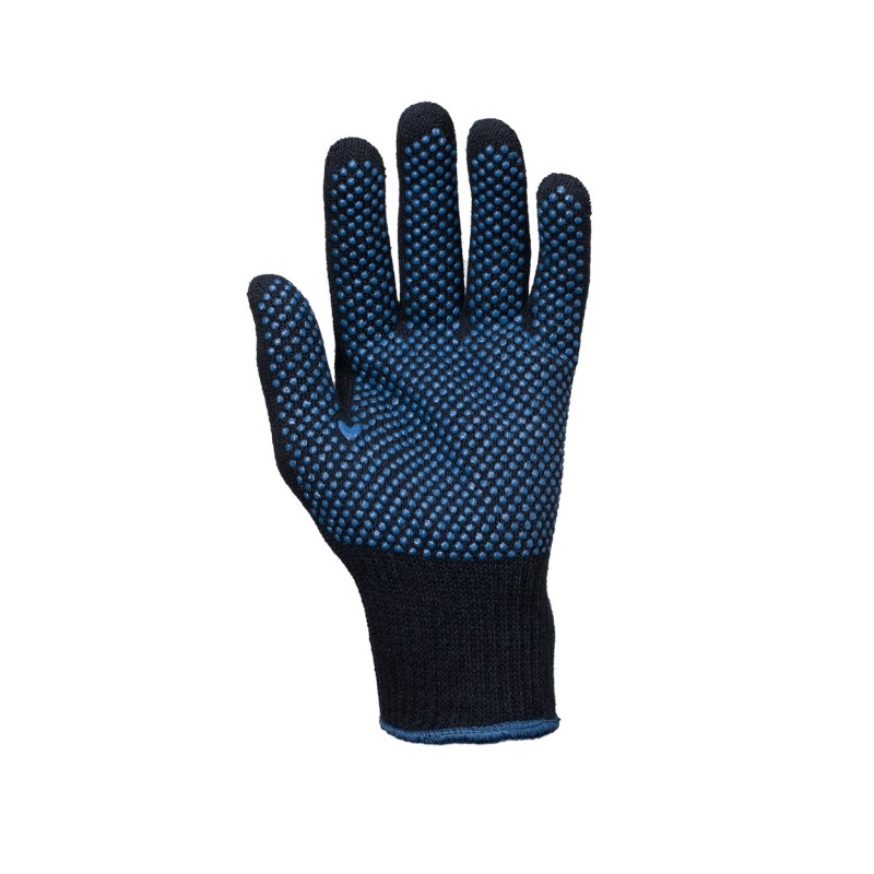 34% Baumwolle, 41 % Polyester, 25% Polyvinylchlorid-Mittelstrickhandschuhe, blaue PVC-Noppen, Strickbund.