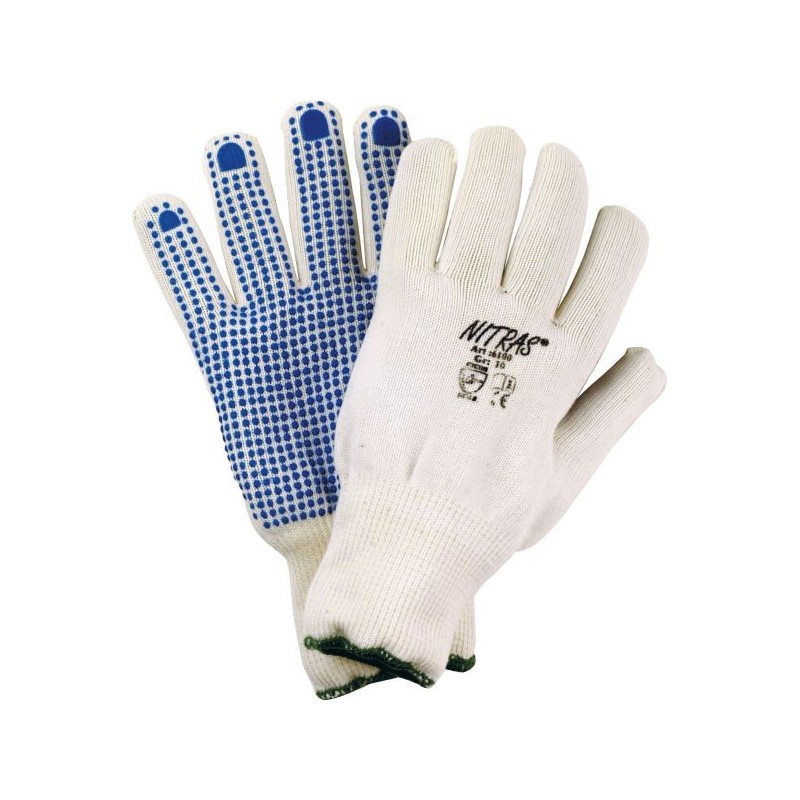 Nylon-Baumwoll-Strickhandschuhe, blaue PVC-Noppen einseitig, mit Strickbund