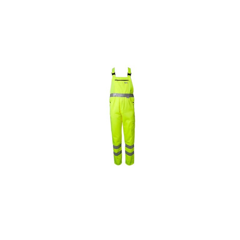 Brustlatz mit Messing-Reißverschluss, zusätzlich aufgesetzte Latztasche, 2 aufgesetzte verstärkte Vorder-taschen, 1 Gesäßtasche, 1 Maßstabtasche rechts, 1 Oberschenkel-tasche mit Patte und Klett, 1 Handytasche, Bundweite verstellbar, Reißverschluss im Hosenschlitz, hochgezogenes Rückenteil mit solide konstruiertem elastischen Zwischenteil, Sicherheitsschnallen an den Trägern.