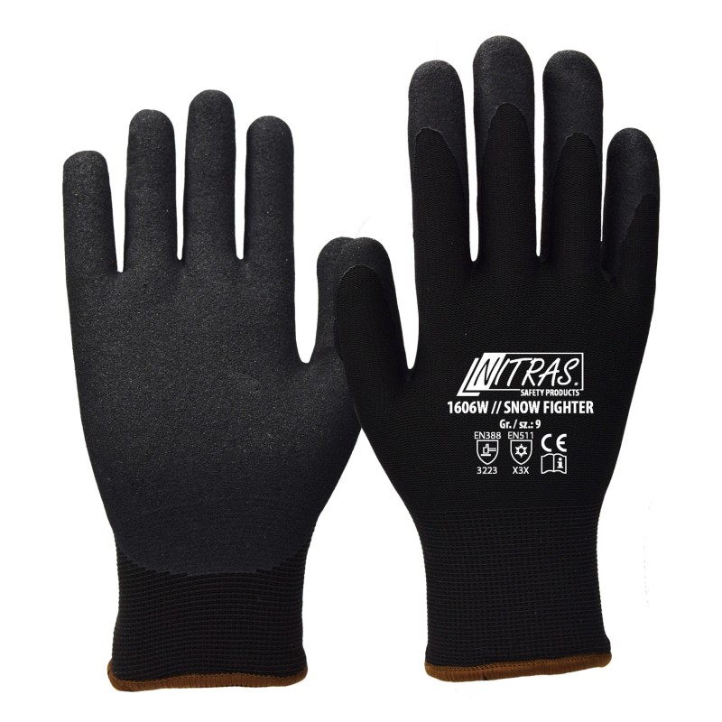 Graue Nylonhandschuhe mit schwarzer, gesandeter Nitrilschaumbe-schichtung auf Innenhand und Fingerkuppen, Futter: Terry-Schlingengewebe.