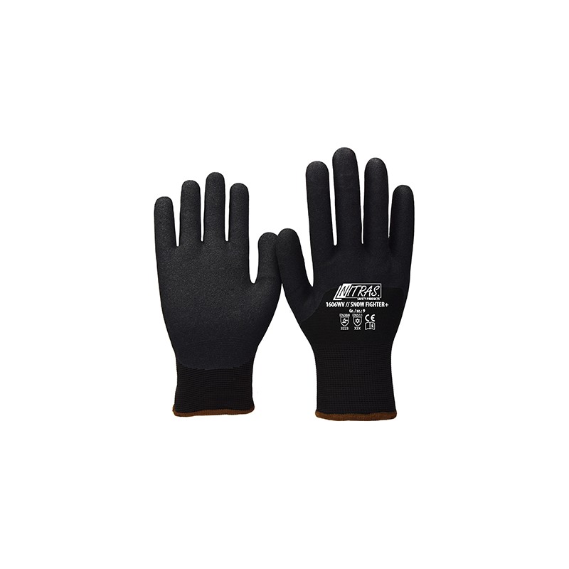 Graue Nylonhandschuhe mit schwarzer, gesandeter 3/4-Nitrilschaumbe-schichtung auf Innenhand und Fingerkuppen, Futter: Terry-Schlingengewebe.