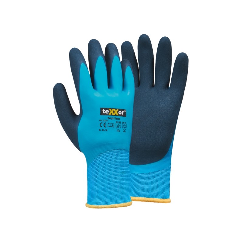 Nylon-Strickhandschuhe, mit hoher Schnittschutzklasse (4! der EN 388), mit Latex-Vollbeschichtung (blau) und zusätzlicher besandeter (Sandy Finish) Latex-Handflächenbeschichtung (dunkelblau), Daumen vollbeschichtet, Strickbund, wärmendes, graues Acrylfutter (loop brusched)